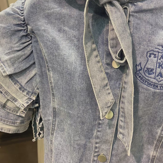 Unleash your inner fashionista with our Preorder Denim Ruffle Blouse, featuring a button up design and elegant neck tie detail. The soft denim fabric has the perfect amount of stretch, ensuring a comfortable and flattering fit. Order your true size for a busty figure, if you are between sizes or smaller busted order down a size for a more streamlined silhouette.